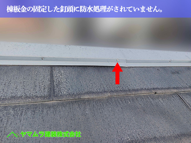 - 棟板金の釘に防水処理がなく、下地が腐食している可能性が高い。