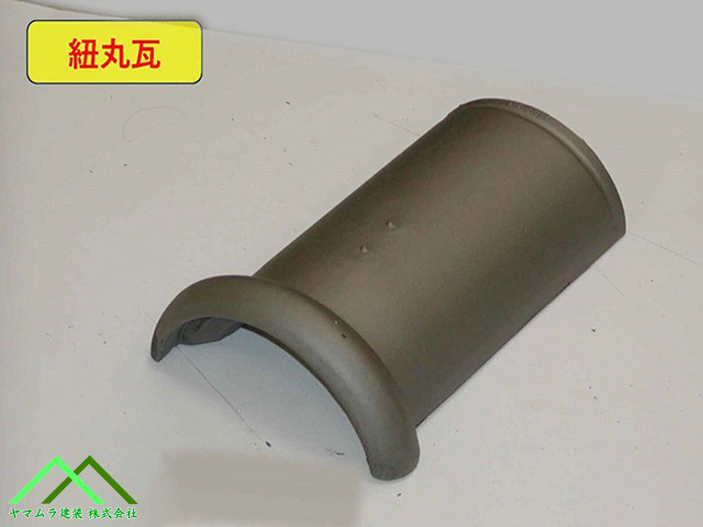 「冠紐丸瓦(紐丸瓦)」は、丸瓦同士の接合部分を覆うために、先端が半円状に盛り上がった「紐」と呼ばれる部分がついている冠丸瓦の派生品です。
