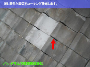 さらに、落下しそうになっていた先端の瓦(軒先瓦)はビスで頑丈に固定し、その周辺の瓦(平瓦)も一枚ずつ専用の接着剤で補強することで、今後の強風に備えました。