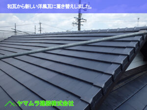 現在は、お客様にお選びいただいた「洋風平板瓦」を葺き上げる作業を進めています。