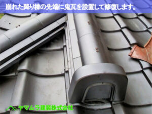 被害は、屋根のてっぺんから斜めに下る「降り棟」という部分で起きており、その先端にある「鬼瓦」が落下してしまっていたのです。