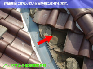 本来、谷樋の縁は瓦を小さく加工して隙間ができないように丁寧に葺くのですが、その重要な加工瓦が全く設置されておらず、下地が見えるほどの隙間ができていました。