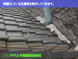 まず、問題となっている古い一階部分の屋根から、瓦を一枚ずつ丁寧に剥がしていく作業から開始します。