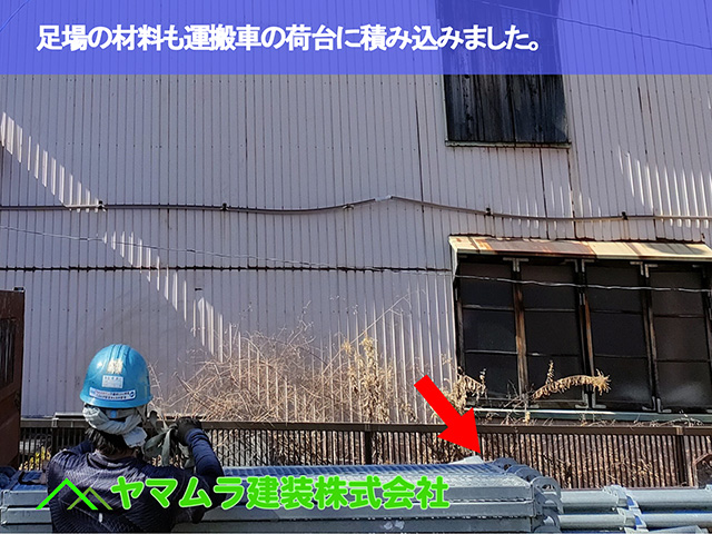 養生が完了した後、資材を積んだトラックをシート横に付け、足場部材の搬入を開始しました。